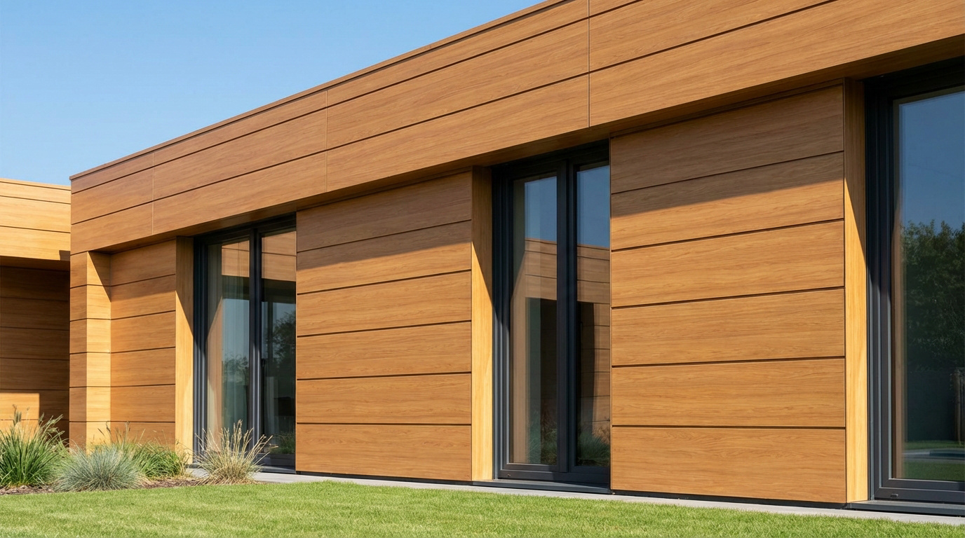 Façade contemporaine revêtue de bardage clin aluminium imitation bois avec grandes baies vitrées et pelouse verte.