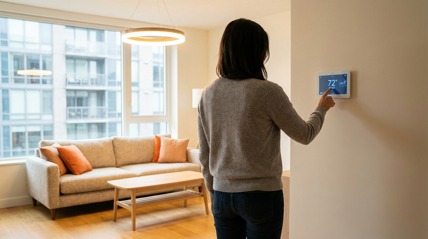 Personne ajustant un thermostat mural intelligent dans un salon moderne. Vue sur des bâtiments par la fenêtre.