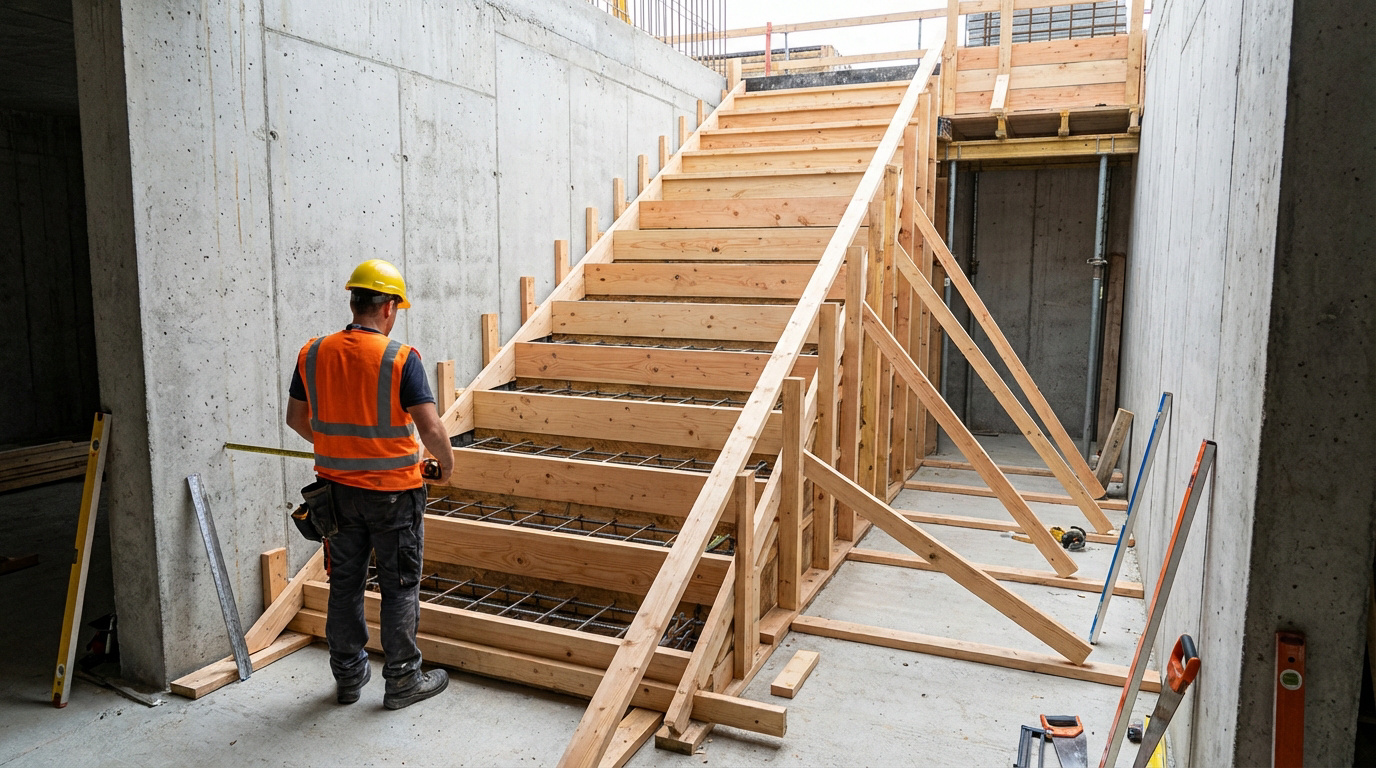 Ouvrier mesurant un coffrage d'escalier en bois avec ferraillage, entre deux murs en béton, sur un chantier.