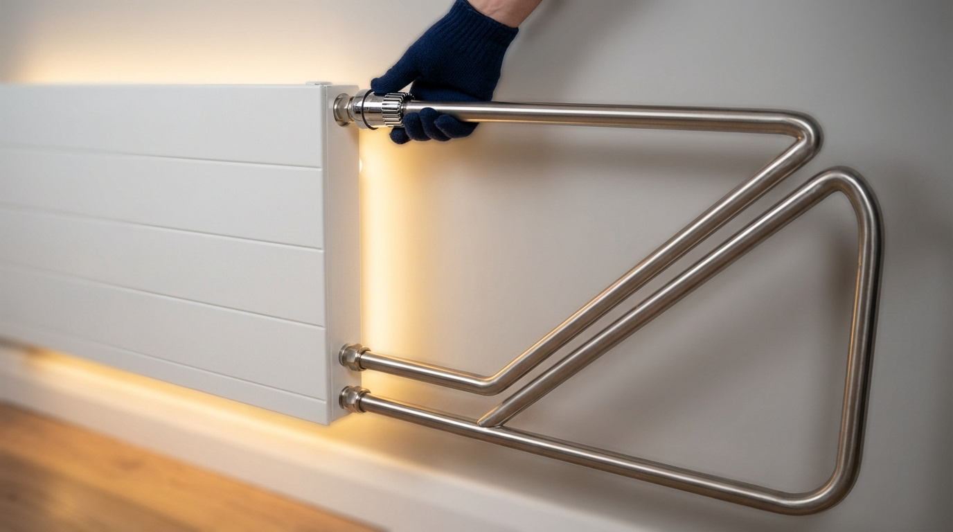 Main gantée installant un porte-serviettes chromé sur un radiateur blanc design avec rétroéclairage chaleureux.